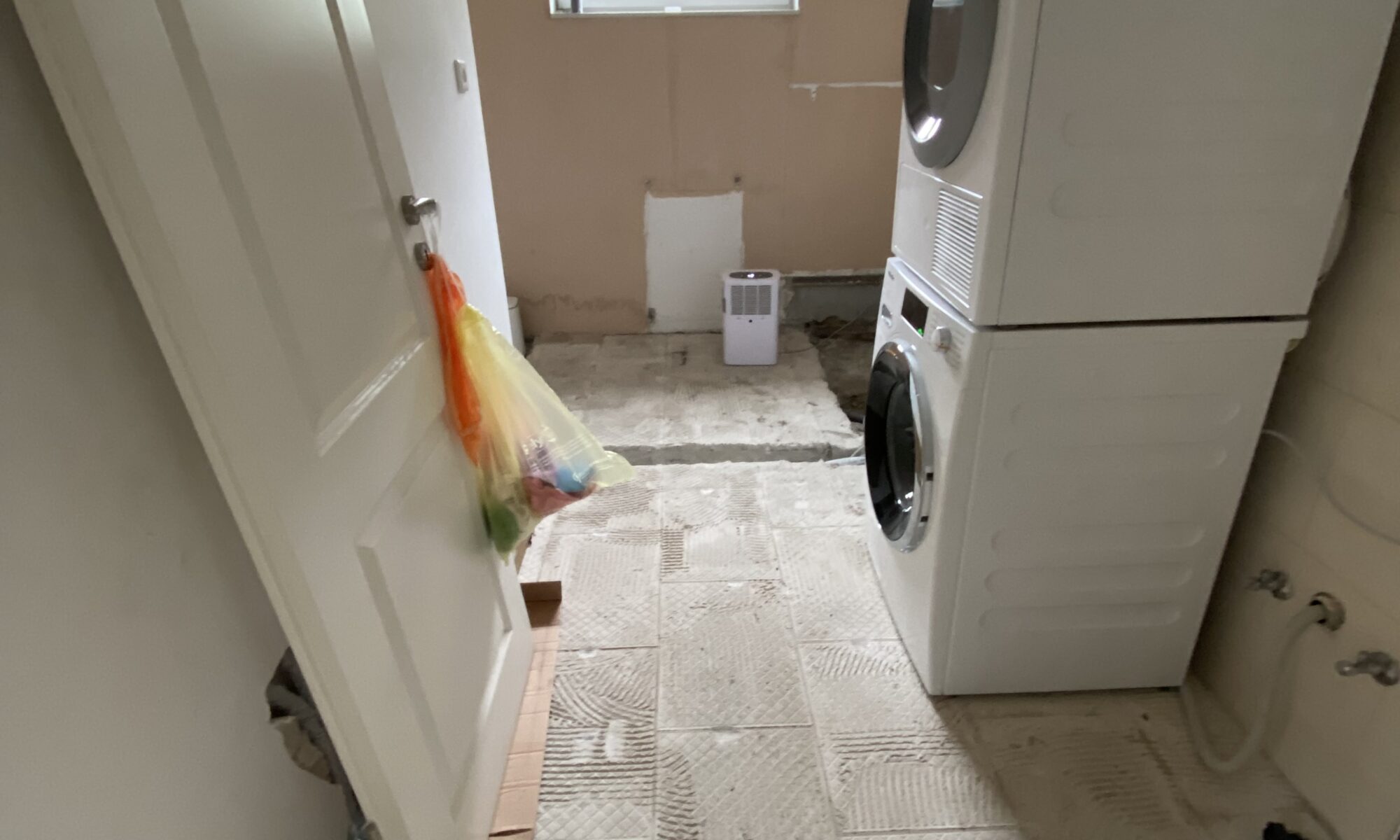 So machen wir uns jetzt daran eine geräumige bodentiefe Dusche und ein Waschbecken einzubauen, alles zu fliesen zu lassen und einen Bereich für Waschmaschine und Trockner einzurichten.